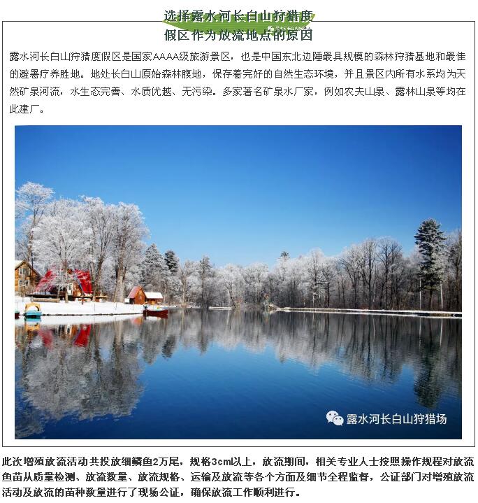 由抚松县水利局主办,抚松县渔政渔港监督管理站承办“2018年抚松县水生生物增殖放流活动”工作组,在11月3日,来到了露水河长白山狩猎度假区组织开展了水生生物增殖放流活动。