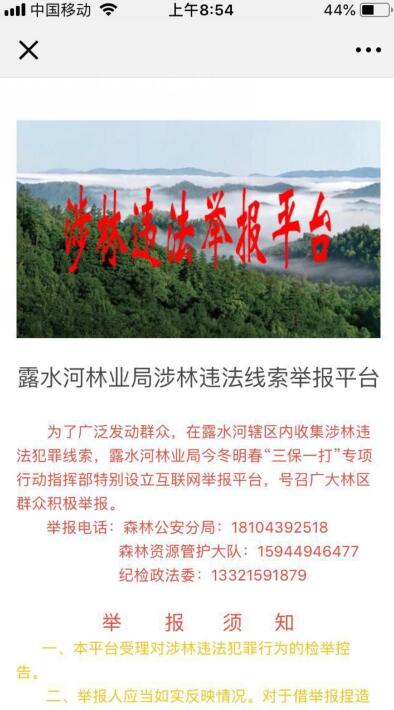 局纪检政法委还开辟了涉林违法举报平台,设立了举报邮箱,公布了举报电话。局党委工作部将举报平台二维码印制在宣传横幅和《告知书》中,便于林区居民群众提供涉林违法案件线索,发动全林区社会力量,有效打击涉林违法犯罪行为。期间,印制了《露水河林业局打击涉林违法犯罪行为告知书》4000余份,将陆续发放到林区居民群众和中小学师生手中。同时,在局门户网站、微信公众号和《露水河林业报》开辟专栏,及时反映“三保一打”专项行动的工作推进情况和经验成果。