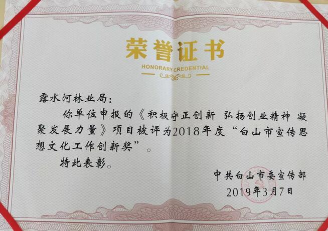 前不久,我局党委全面梳理总结了2018年宣传思想文化工作创新做法,并形成经验材料报白山市委。据此前公布的获奖项目名单显示,露水河林业局党委以《积极守正创新 弘扬创业精神 凝聚发展力量》为题的宣传思想文化活动纪实,获“白山市宣传思想文化工作创新奖”。
