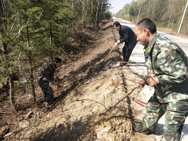 清晨,大家赶到露水河长白山狩猎场公路沿线,扶直新栽植的槭树科树木、捡拾垃圾、清理路肩石块,美化了家乡环境,全体党员干部用实际行动贯彻落实党章关于加强党员教育管理的要求,积极践行“两学一做”。